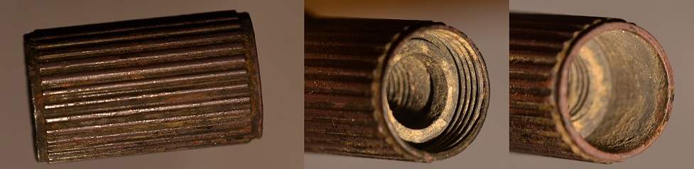 Voici un petit objet trouvé en forêt qui me fait penser à une molette de jumelle ou autre. La partie intérieur est filetée et tournante et indépendante de l'autre filetage.