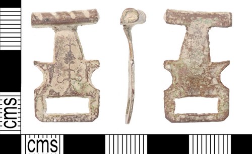 Momo, l'objet que tu nous présentes est bien romain, le style y est à cent pourcent, mais celui de Sparow est beaucoup plus tardif. Sa facture plate au revers et les motifs évoquent clairement pour moi la période que j'ai nommée précédemment ''autour du XVII ème'', c'est-à-dire en fait les XVI, XVII et XVIII èmes siècles, pour lesquels on trouve beaucoup de fermetures à crochet ou à bouton à la place des boucles. Je vous joins en exemple un objet répertorié dans le P.A.S sous le nom de ''strap fitting'', et on trouve beaucoup de ces systèmes d'attache dans gougueule en tapant ''belt clasp''.