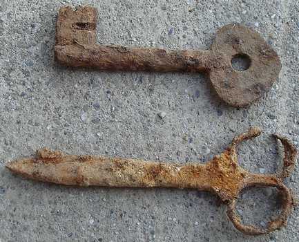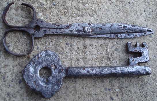 Voici une clef et des ciseaux trouvés ensemble en forêt avant l'électrolyse...