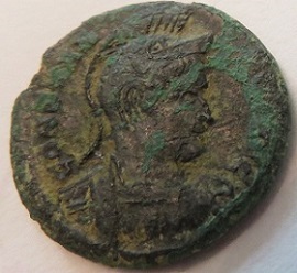 son buste casqué (casque décoré d’une étoile ou chrisme derrière l’oreille de l’empereur) et cuirassé à droite.