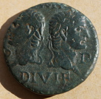 Deux têtes adossées, à droite celle d'Auguste laurée et à gauche celle d'Agrippa