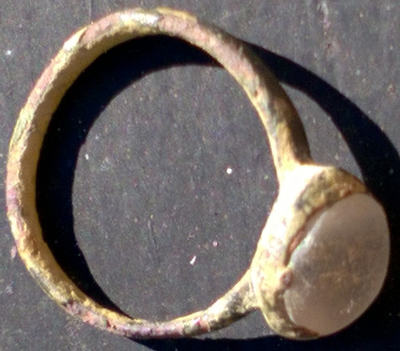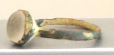 Il est toujours assez difficile de dater précisément un bague. Celle-ci est faite d'un seul bloc, le chaton circulaire entoure un cabochon qui semble être en pâte de verre. Ce cabochon est serti par des ergots de maintien issus du bloc.