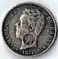 Portugal : En raison de la grande pénurie des monnaies d’argent portugaises dans les Açores vers la fin des années 1880, le gouverneur civil autorise le contremarquage des pièces de 5 pesetas du roi espagnol Amadeo I avec la couronne portugaise et les lettres G.P., ce qui permettait leur libre circulation dans les îles. Presque toutes les monnaies espagnoles portaient la date 1871.