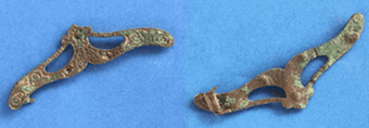 L'objet étant réduit de moitié, j'ai beaucoup de mal à voir les détails (restes de système de fermeture), mais au vu de la taille (8cm) et des emplacements de perles (verroterie), je pense que c'est une pince à cheveux du début XXè siècle...