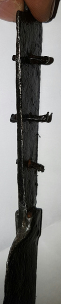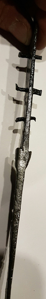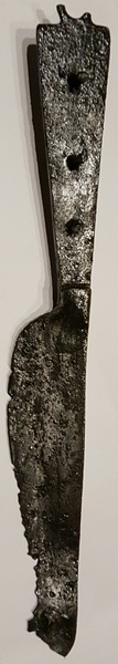 Joli coteau.J'en ai vu un de très ressemblant, à peine plus court (2 cm de moins) avec une lame pointue à dos rectiligne et un manche triangulaire (sans anneau) à rivets pour la fixation de deux plaquettes en matière périssable, ainsi qu'une butée d'arrêt moulurée entre la lame et le manche. Il vient du département du Doubs... mais il n'est malheureusement pas daté. J'aurais tendance à dire entre le XVI ème et le XIX ème, mais je ne suis sûr de rien.