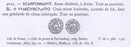 A l'avers autour du buste Ă droite,on lit SCARPONNA FIT ,ce qui n'est pas le cas de ta monnaie ,mĂŞme si on retrouve les lettres communes .