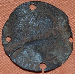 Besoin de votre aide pour identifier ce reste de monnaie...Pas dans un super état, elle avait a priori été fixée sur un support (les 4 trous aux points cardinaux).