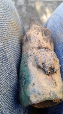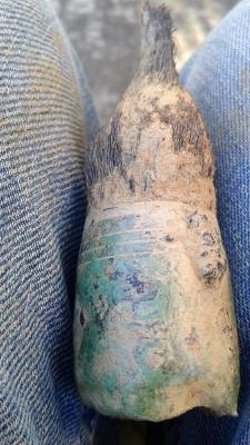 J'y verrai bien la partie d'une brosse à rechampir ( plus exactement la virole, qui est ce cerclage en cuivre ) usée car à force de rechampir, ce genre de brosse finie toujours comme ceci.