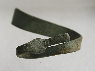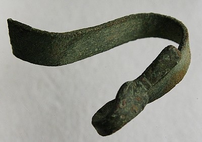 Il me semble en tôle de bronze, Longueur dépliée ~130mm, largeur maxi 9mm et épaisseur 1,5mm. Quelques traits de décoration côté non cassé...