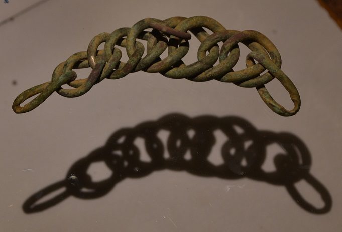 D'autre part, la forte usure sur les anneaux aux deux extrémités me font plus penser à un élément de harnachement qu'à une jugulaire de casque