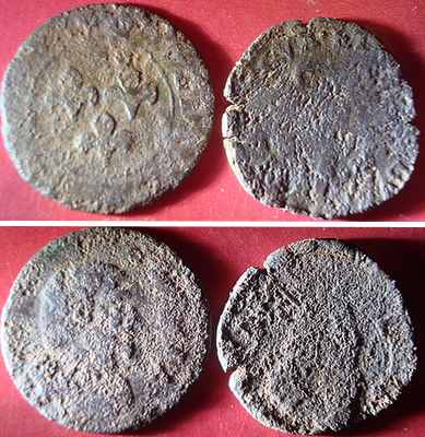 J'ai trouvé ces deux monnaies dans le même trou cet aprem. Les deux sont en très mauvais état et je ne vous en voudrai pas si vous ne pouvez pas m'aider , mais je tente quand même en postant les deux ensemble, des fois que l'une vous inspire pour l'autre....