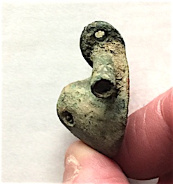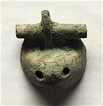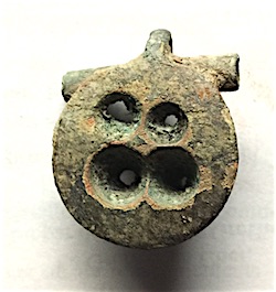 Objet en Bronze, 33 Grammes, 2,5 cm de diamètre avec 4 trous qui le transperce de part en part et un annelé ou bélière pour l'accroche