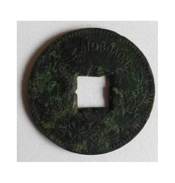 Encore une monnaie due à notre famille de graveurs, les Barre ! ( dont le nom est ici retranscrit en BAPPE ). Pour information il s'agit de dix lepta, soit deux oboles, le lepton étant le centime de la drachme. Pas d'idée précise concernant le trou carré, peut-être à mettre en relation avec les marquages publicitaires.