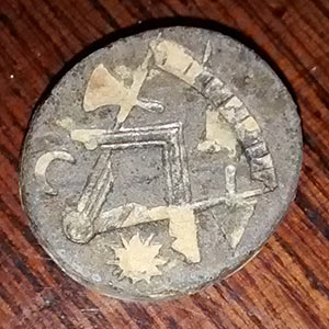 Sur une face un buste, et sur l'autre des symboles liés vraisemblablement à la franc-maçonnerie. L'objet est percé verticalement dans la longueur.