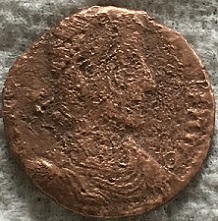 Côté avers, on voit un buste d'empereur drapé, couronné, côté revers, j'ai l'impression d'y voir un soldat terrassant un cavalier (type maiorina de Constance Galle) et il me semble lire en bas pour l'atelier SPA (Constantinople)