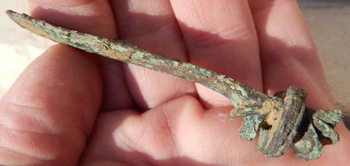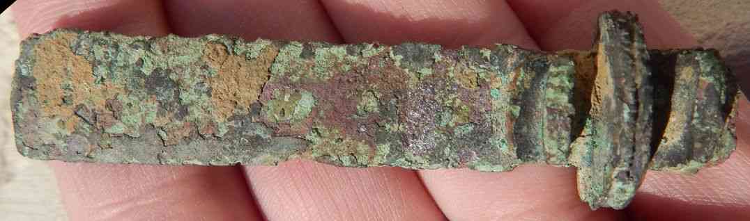 Amis prospecteurs, bonsoir, permettez moi de vous soumettre cet objet pour identification, je pense à un fragment de fibule, mais je n'en ai aucune certitude, merci pour vos interventions, l'objet est en bronze patiné, il mesure 75 mms et pèse 25 grs. Merci encore et bonne soirée.