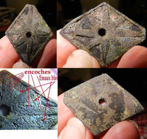 à ma grande surprise l'objet semble intéressant ; en effet des émaux (?) bleus apparaissent entre chaque bras de l'étoile.