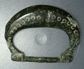 Boucle ovale simple en forme de D s'élargissant régulièrement comportant un beau décor et barre de sangle rétécie. Datation 1450/1500.