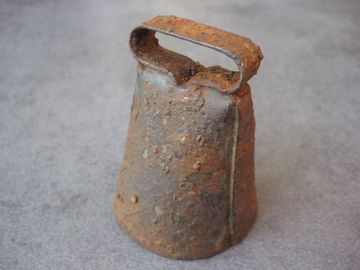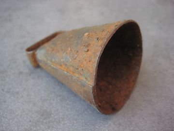 Pourriez-vous m'aider à donner une datation à cette clochette en fer trouvé dans un sous-bois du Finistère? La hauteur est de 65mm, et la largeur maximum est de 45mm. A l'intérieur il n'y a plus de battant, juste les restes d'un bout de fer plat plié.