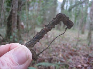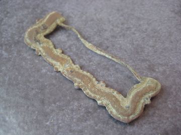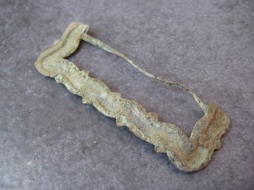 Pourriez-vous me donner une utilité et une datation pour ce morceau de boucle en bronze ( ou cuivre ) découvert dans un sous-bois du Finistère ? Longueur : 55mm, la largeur : 20mm ( qui devait être plus grande avant la cassure ), et l' épaisseur : 1mm. La 1ère photo, est lors de sa découverte :