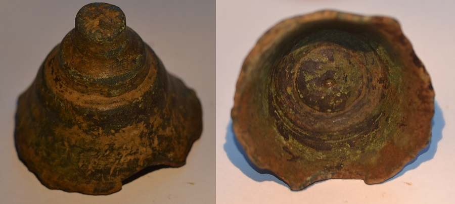 Genre de cloche en bronze, 40 mm de hauteur pour 45 mm de diamètre. Poids : 104 grammes.