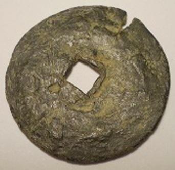 la facilité nous laisserait croire qu'il s'agit d'une monnaie chinoise vu le trou carré au centre toutefois, ce trou semble artisanal et, il n'y a pas pas de trace de lettres chinoises