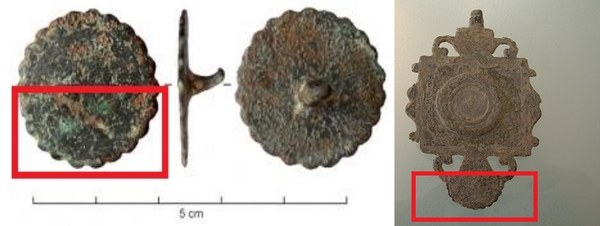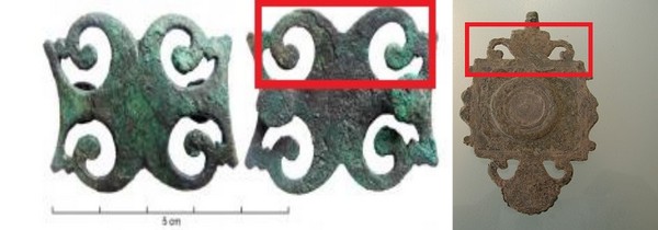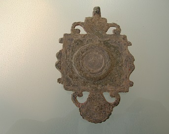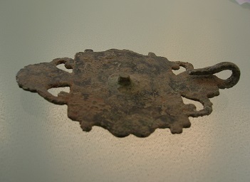 Pour moi ce n'est ni une agrafe de col ( car dans ce cas il y aurait un genre de barre de sangle) ni une agrafe de demi-ceint ( car ces objets ont toujours plusieurs rivets, en fer et non pas coulés, puisqu'un seul rivet laisserait l'agrafe tourner sur elle-même ). En outre, la forme n'est connue ni pour ces objets-ci, ni pour ceux-là. Je pense qu'il s'agit d'une applique ( de harnais ? ) fixée par un rivet central et par une ''griffe'' passant derrière la sangle de part et d'autre.