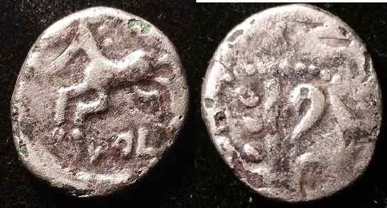 Denier VOL au cheval galopant et au caducée, attribué aux Allobroges.