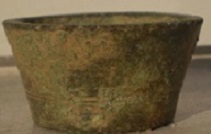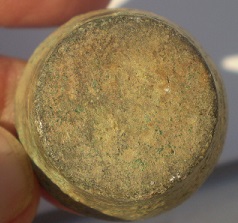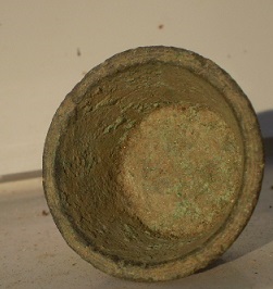 Je vous soumets ce petit godet en bronze, 25 grs pour un diamétre de 3cm. Sur l'extérieur il y a deux lignes assez distinctes.