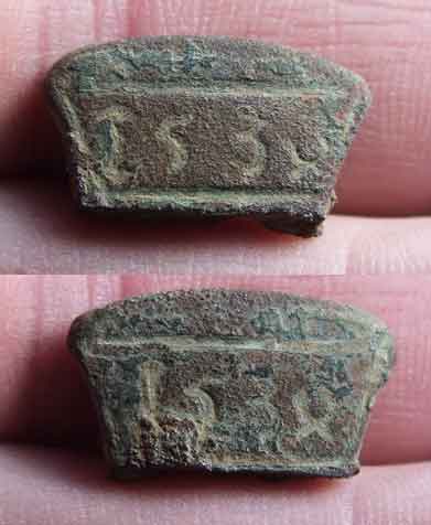 J'ai trouvé ce petit morceau de métal avec une date inscrite dessus '1537' sur les deux faces. Il mesure envirion 2cm pour 1cm, pèse 6g et semble avoir été sectionné et séparer d'un ensemble.