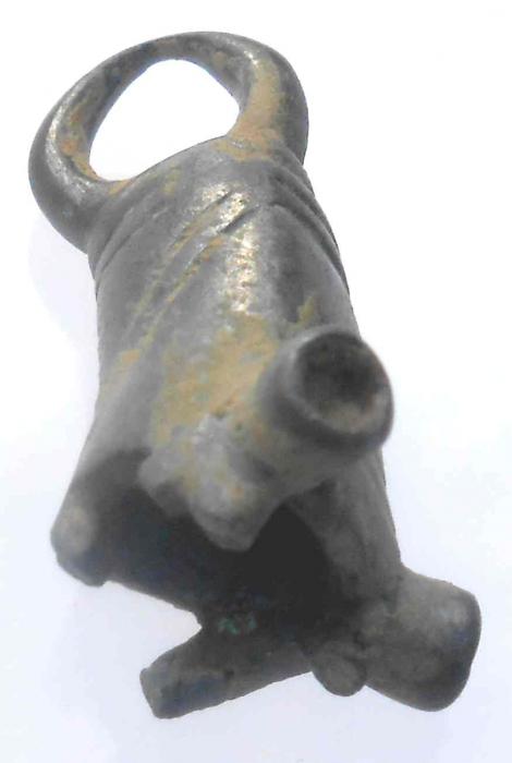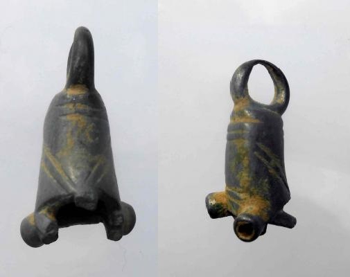 Voici une partie d'un artefact en bronze trouvé lors de ma dernière sortie (voir mon post 132193R0 côté chercheurs) comportant un anneau de suspension et décoré succinctement de quelques traits horizontaux et obliques.