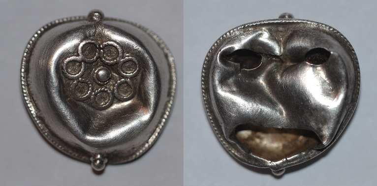 Ici l'unique découverte de ma part, en laiton et avec une légère ciselure ornementale sur l'avers.