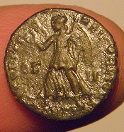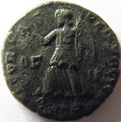 Il semble que l'atelier monétaire d'Arles ait été le seul à frapper ''OF/II'' dans le champ ( penser à taper ''OF / II'' avec des espaces également pour une recherche plus complète ). Donc nous avons toutes les raisons de penser que cette monnaie en provient. Par contre je ne comprends pas ce qui permet à Diplodocus d'affirmer qu'il s'agit de Valentinien Ier et non de son frère Valens, car, bien que ce revers accompagné des lettres ''OF / II'' soit certes plus rare pour Valens, on en trouve tout de même un certain nombre d'exemplaires qui lui sont attribués, comme par exemple NBD 42506 et NBD 52000.
