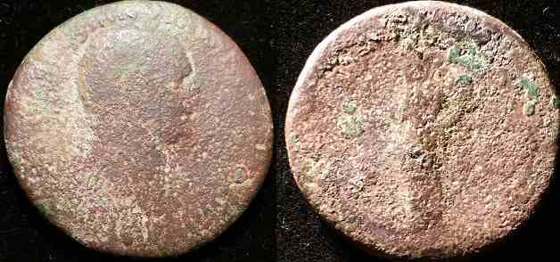 je vous soumets cette romaine très érodée trouvée dans les labours du 26.Sa dimension est assez grande: 33 mm mais je n'ai pas son poids Épaisseur 2,5 à 3 mm