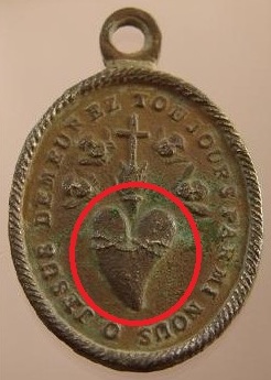 Tes deux nouvelles photos ne me laissent plus aucun doute sur la nature du métal qui est bien de l'étain. Ta médaille pourrait être du XIX ème ( à mon avis 1830 au plus tard ), mais le XVIII ème siècle reste pour moi une piste très sérieuse. D'ailleurs sur le revers de la médaille à laquelle nous renvoie Dipodocus on trouve un cœur asymétrique et cette représentation du cœur de Jésus est typique du XVIII ème. Est-ce que la bordure de ta médaille ne serait pas festonnée tout comme elle ?