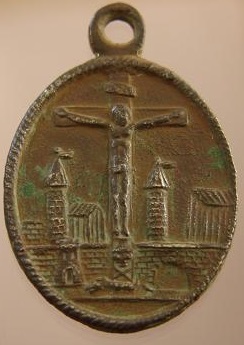 trouvé cette medaille en savoie (ou ce qu'il en reste ) 24 X19 mm, plutôt épaisse 2 mm , on devine un jesus sur une croix avec 1 'piquet' de chaque côté et côté pile moi je vois rien , y a quelque chose mais quoi?