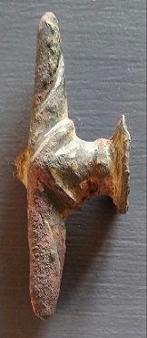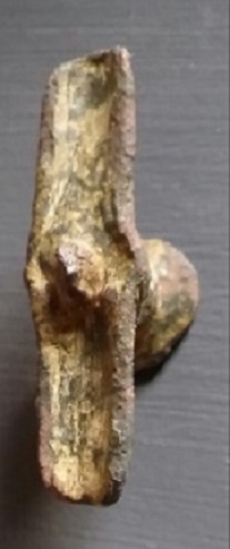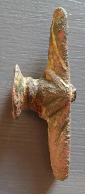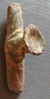 Je pense qu'il s'agit d'un élément de bouton de tiroir ou autre! Il y a la partie en fer qui reste qui devait être dans le bois.