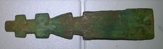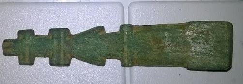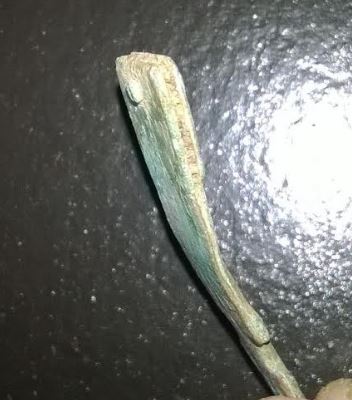 Après une petite sortie le weekend dernier, je vous présente cet artéfact en cuivre. Il fait 5,2 cm de long pour 1 cm à la base (légèrement incurvée, séparée en deux lamellestenues par une petite pointe). Je pense que ce n'est pas tout jeune...