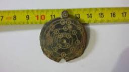J'ai trouvé cette plaque ronde (bien abimée !) en bronze avec des motifs qui décorent tout le tour.