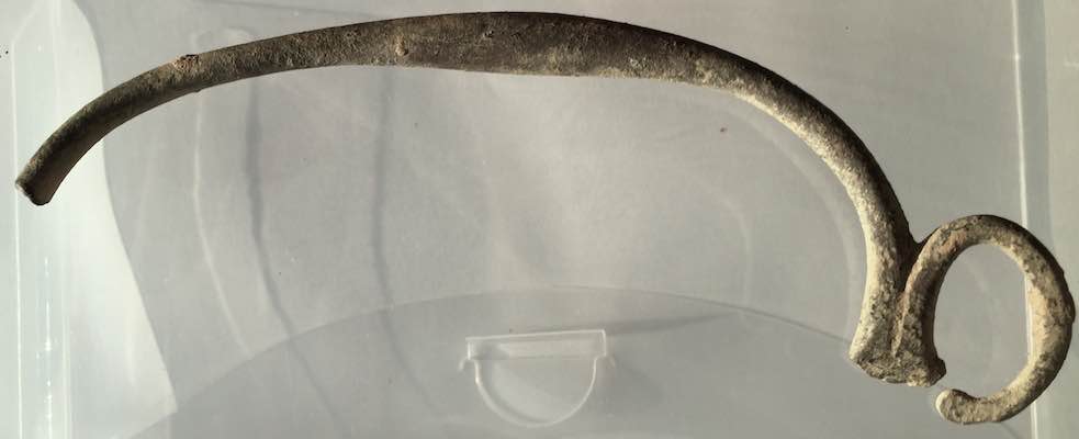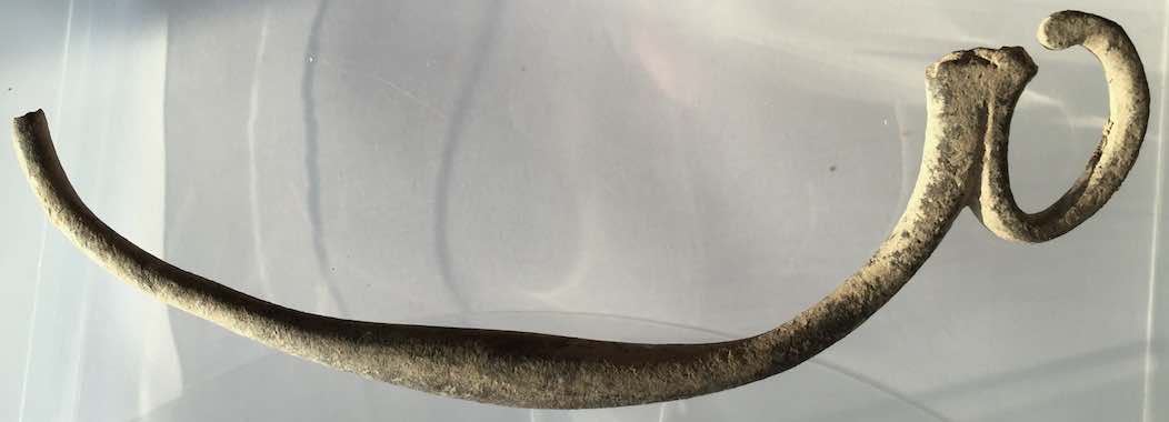 La même sous un autre angle. La petite extrémité, arrondie, a été aplatie et ne semble pas cassée