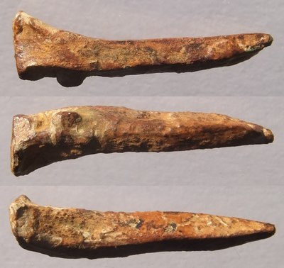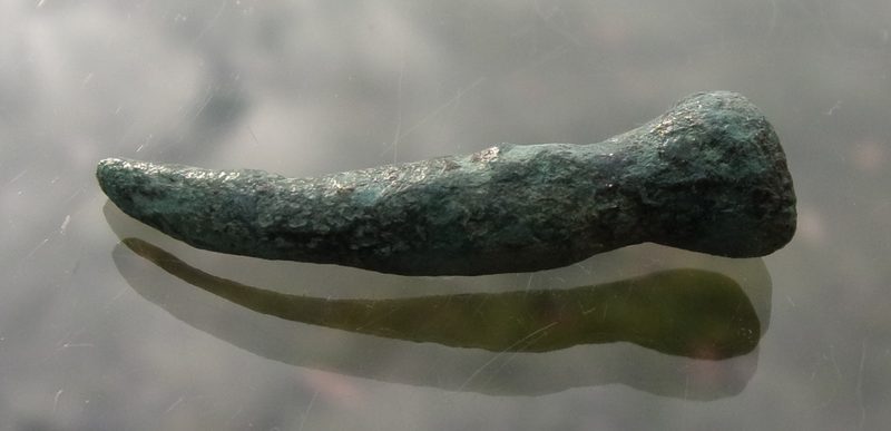 Tout ce que je peux te dire c'est que j'en ai un également, et que ça me semble très vieux à moi aussi : trouvé dans le 21 ; longueur : 27 mm ; Ø de la tête : 7 mm ; masse : 2,7 g ( en bronze malgré la couleur rouille ).