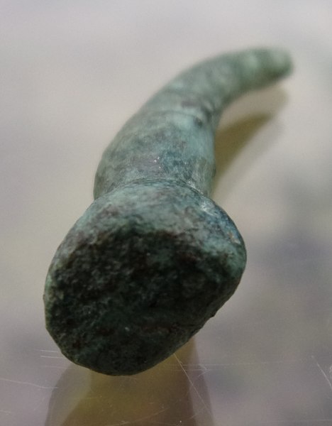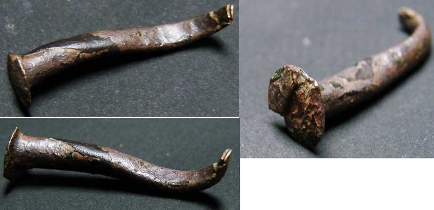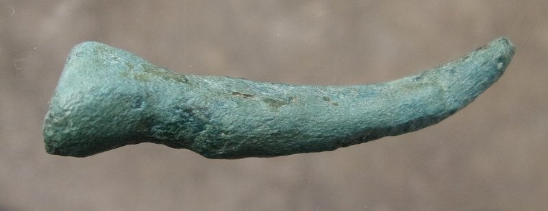 sans savoir ce que c'est j'ai l’espoir prétentieux d'écrire age du bronze ou age du fer, je ne pense pas qu'il soit tordu involontairement, probablement moulé ainsi ''en forme de dent de serpent'' car il a l'air bien massif et ne devait pas servir à clouer les planches de la cabane au fond du jardin mais plutôt de parure de ...