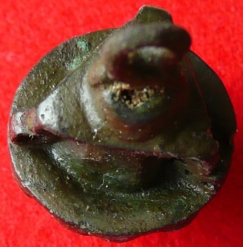 de dessus on voit la partie triangulaire et la bélière avec un trou par lequel j'ai pu faire rentrer une aiguille = l'objet est creux
