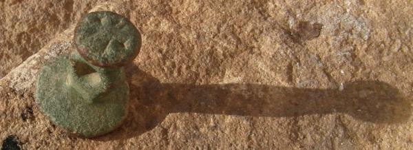 Belle matrice double que voila, appelée aussi 'sceau bobine'. Les deux faces sont gravées. Il s'agît du sceau et du contre-sceau. En principe, on retrouve la même iconographie sur les deux faces sauf que le contre-sceau est anépigraphe. Pour le reste, impossible à déterminer quoique se soit.