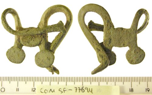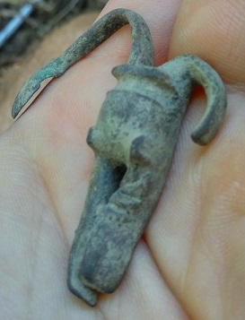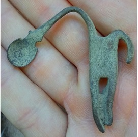 A mon avis nous ne sommes ni sur une fibule ni sur une attache de cape. Ton objet me fait penser à un nécessaire de toilette romain qui aurait été tordu. Mais à confirmer par un connaisseur.