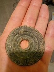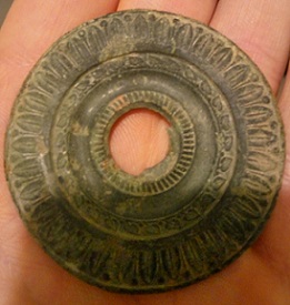 Je souhaites un peu d'aide pour l'identification de cet objet rond troué au milieu, mais pas d'origine car aperçoit des traces de cassure.
