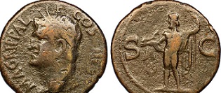 En effet, le portrait d'Auguste avait figuré autrefois, sur les dupondii de Nîmes, accompagné de celui de son ami Agrippa : mais jamais Agrippa n'avait eu de monnaie à sa seule effigie. Caligula en profite : car du côté de son père, il descend de Tibère, fils adoptif d'Auguste ; du côté de sa mère, il descend d'Agrippa. En célébrant ce dernier sur son monnayage, l'empereur Caligula nous rappelle qu'il est à la fois l’arrière-petit-fils d’Auguste, et le petit-fils d'Agrippa.