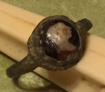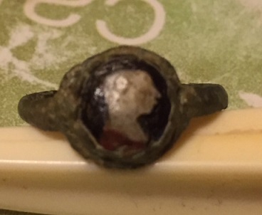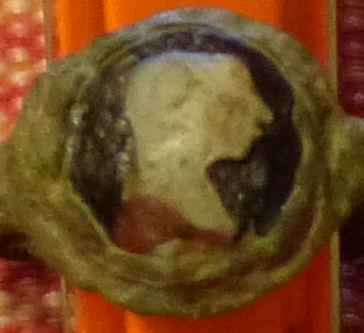 Une petite bague en bronze, avec pierre sertie noire (verre??) sur laquelle il y a l'incrustation d'un profil de femme ?? (en nacre - verre ??) avec en rouge ce qui pourrait être un vêtement haut. Si quelqu'un a une idée ??? Je pense à une bague romaine ??? merci d'avance tous.