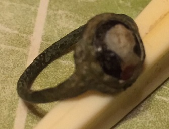 Merci à tous pour vos réponses et vos approches sur cette bague. Une monnaie romaine trouvée non loin, mais bon, pas facile de déterminer de quelle époque elle est vraiment. Je n'ai pas trouvé de photo pouvant montrer un sertissage identique de la pate de verre. Si vous avez une image, je suis preneur Vincent. Merci à tous et à bientôt.