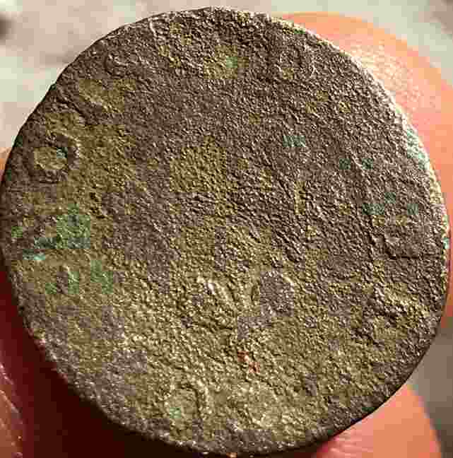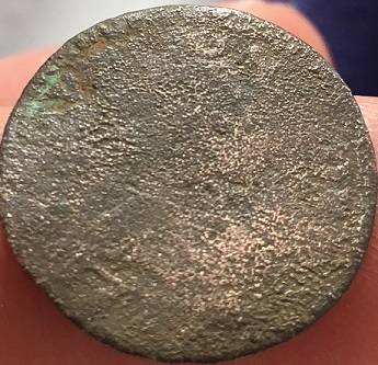 A l'avers, malheureusement il ne reste pas grand chose. On devnie nu buste qui regarde à droite et on voit quelques restes de titulatures: ON à midi et ON ou OI à droite (entre 2h et 3h).